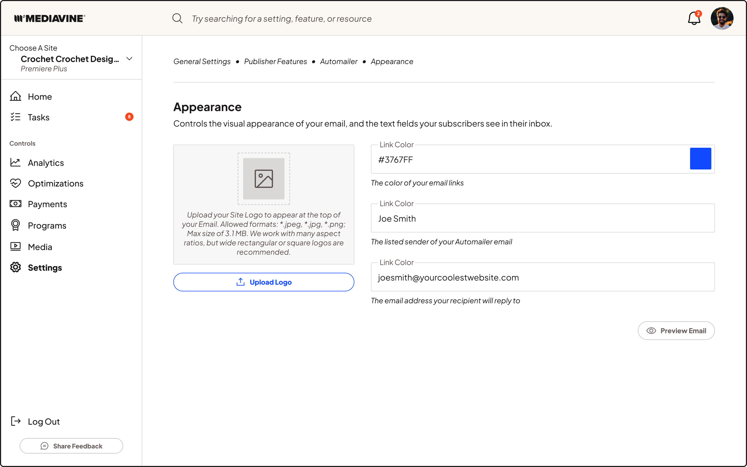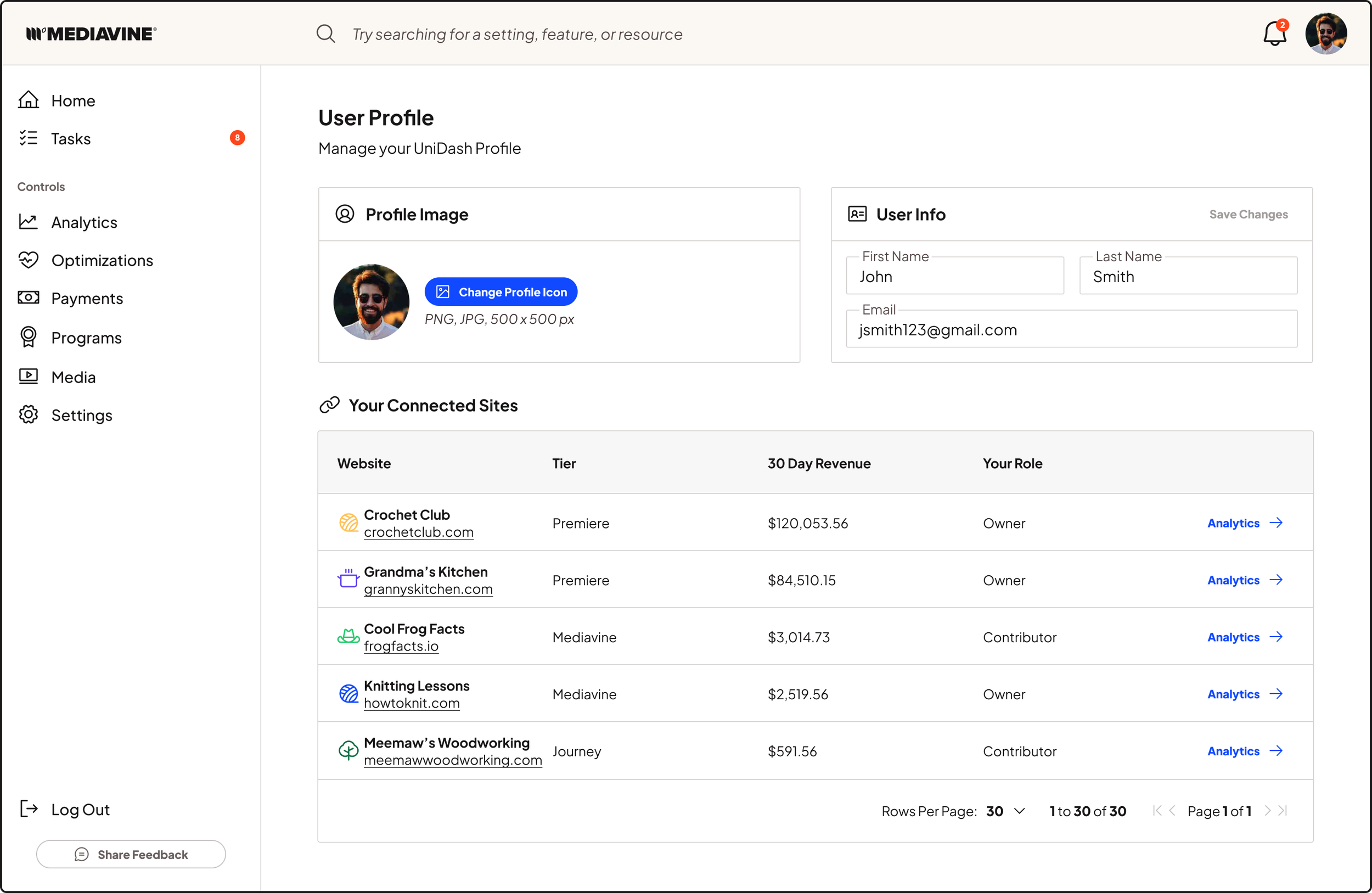 Here’s my design for Mediavine’s clean, lean, publisher-focused user profile: a single view for personal info, profile image, and every site the user manages. The spacious layout and clear typographic hierarchy reduce cognitive load and scale smoothly for users managing dozens of different sites.