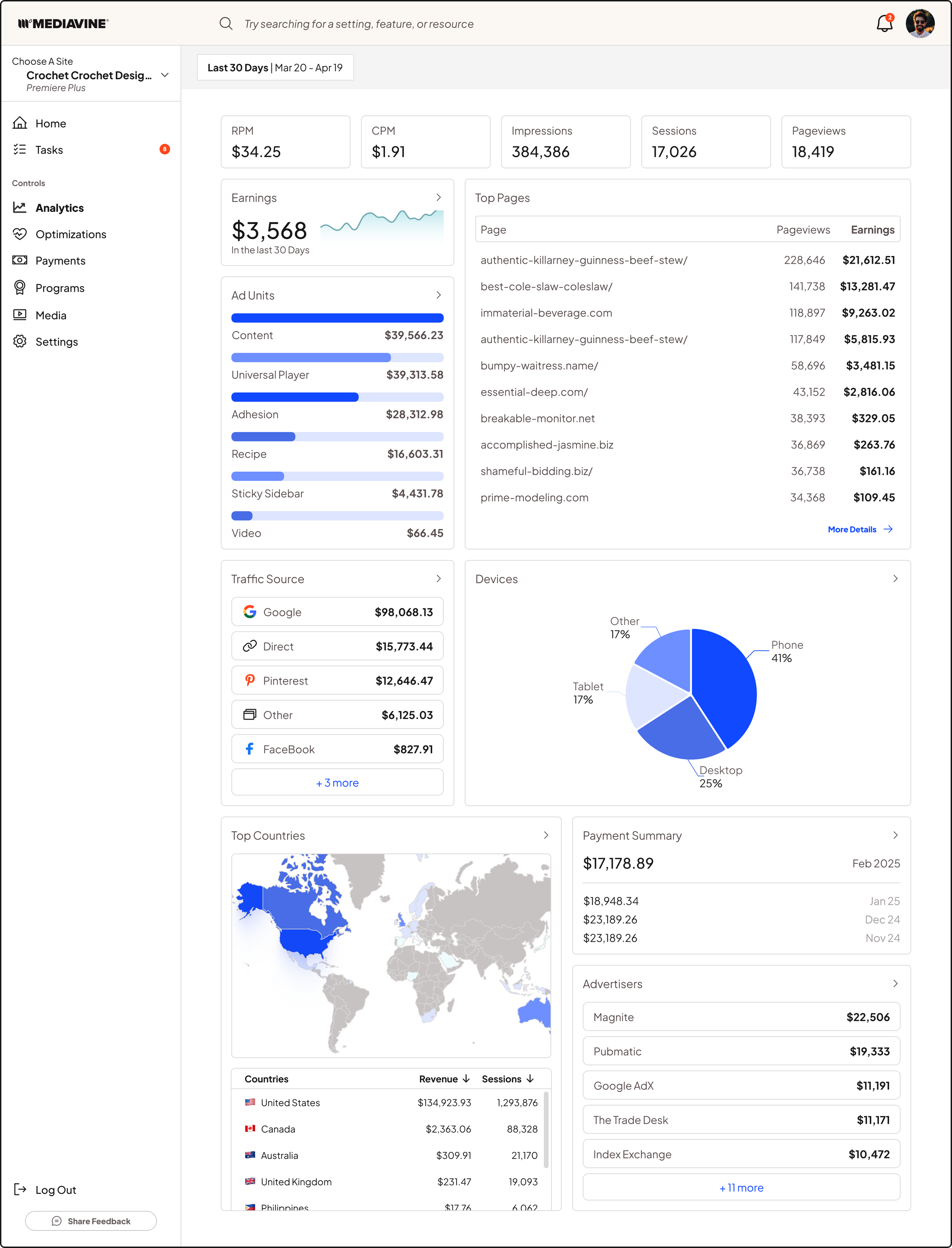 Mediavine’s old publisher portal looked like something from 2008, and was very overwhelming to look at. As part of Mediavine’s rebranding effort in late 2025, I designed several pages for the new Publisher Dashboard, and was in charge of creating and maintaining the new Design Library and all of its systems and assets.