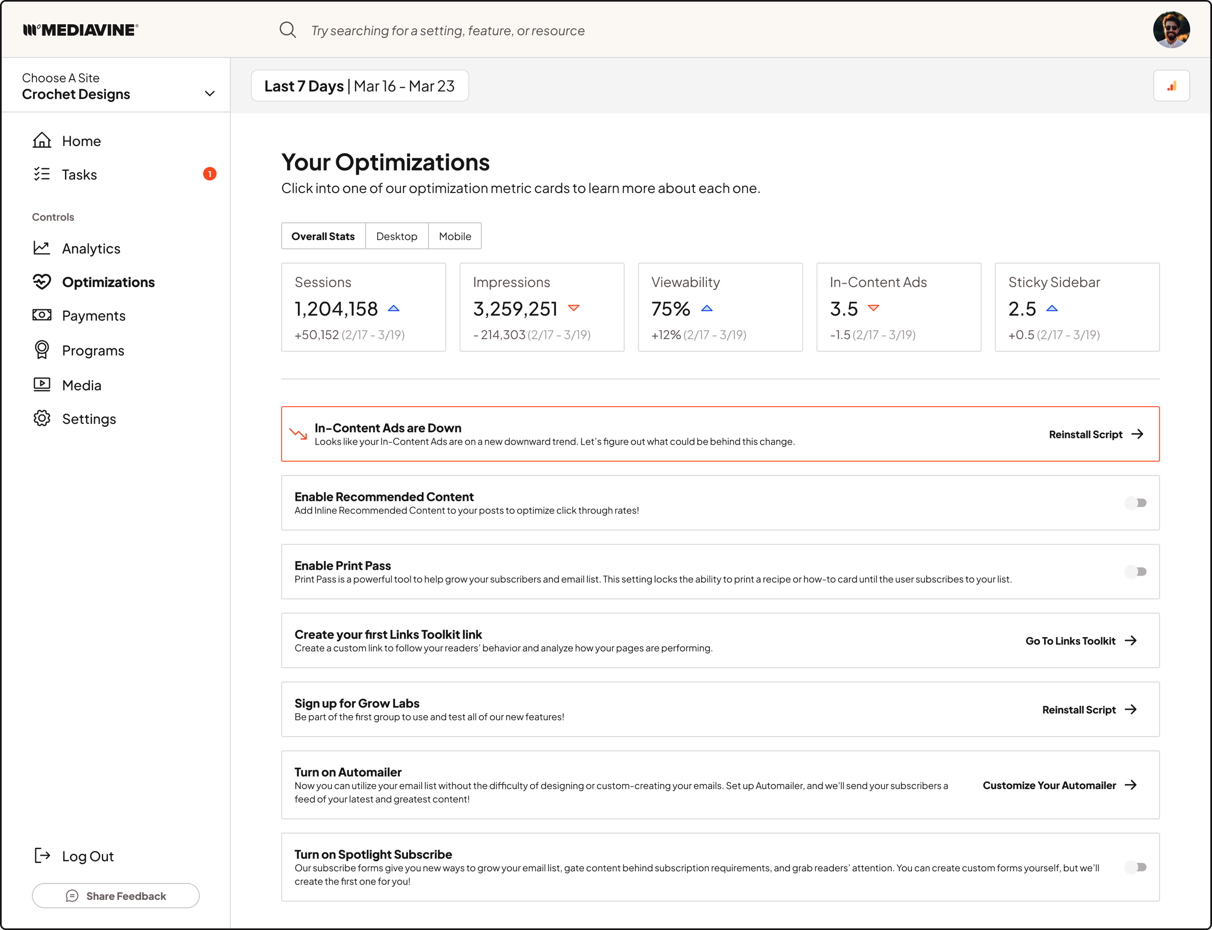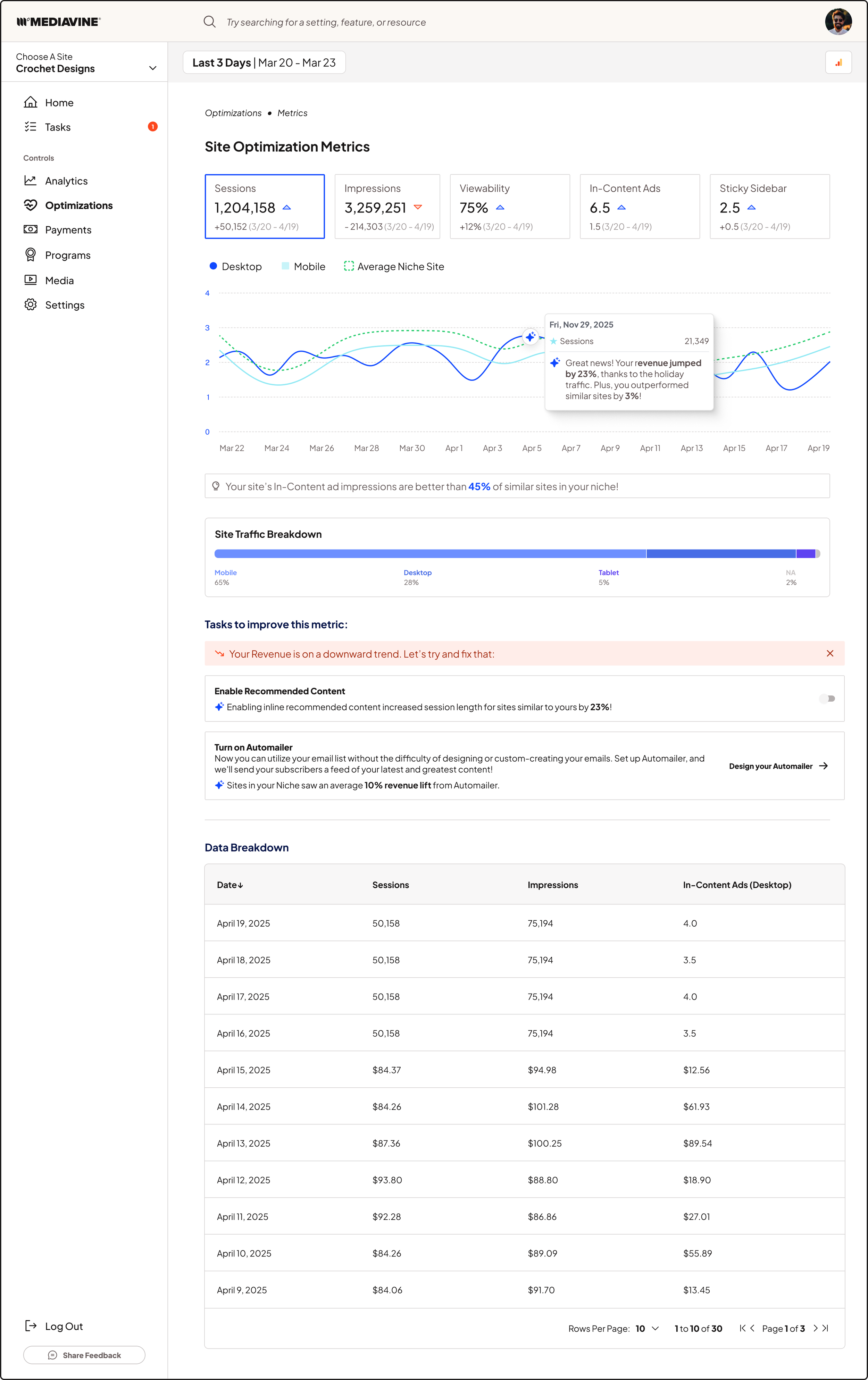 Here lies the optimizations area in Mediavine, an upcoming feature that will offer publishers more control over their site’s performance, and give users AI-powered analysis tools to help optimize and drill into what they’re doing right, and what can be improved on.