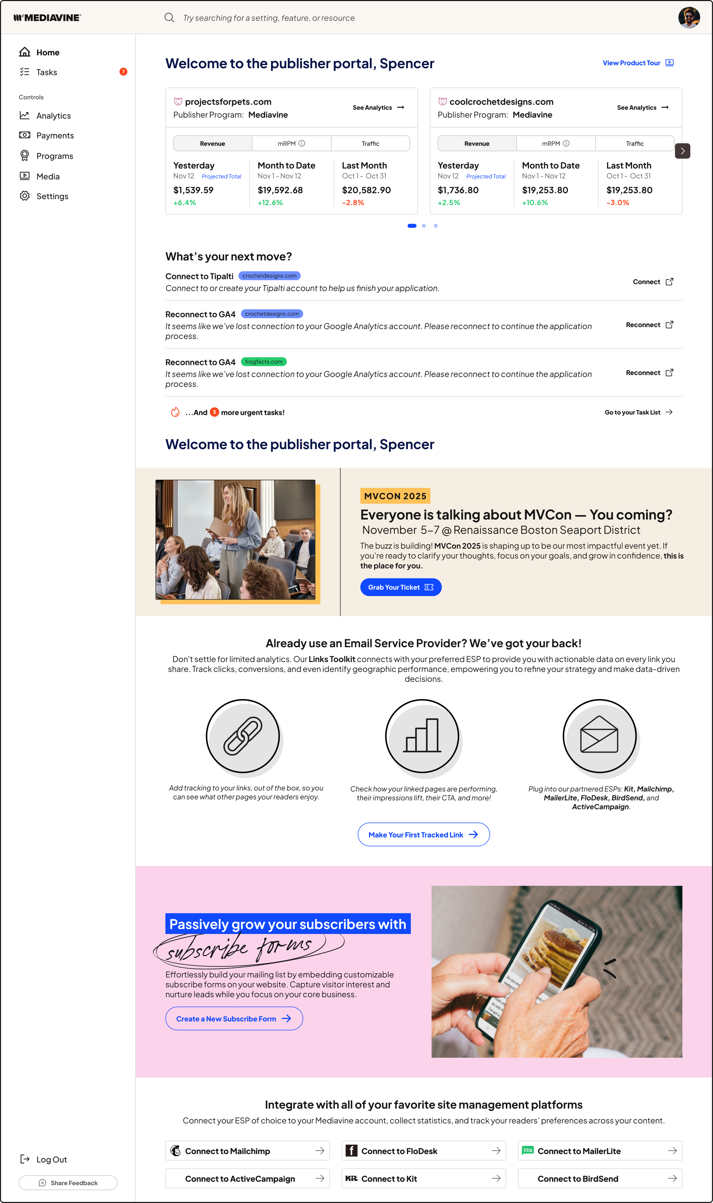 This layout prioritizes immediate orientation, with account cards and revenue snapshots at the top to give publishers a quick health check. Below is a clear task list driving users toward high-impact actions (connect tools, fix analytics) with one-click CTAs.