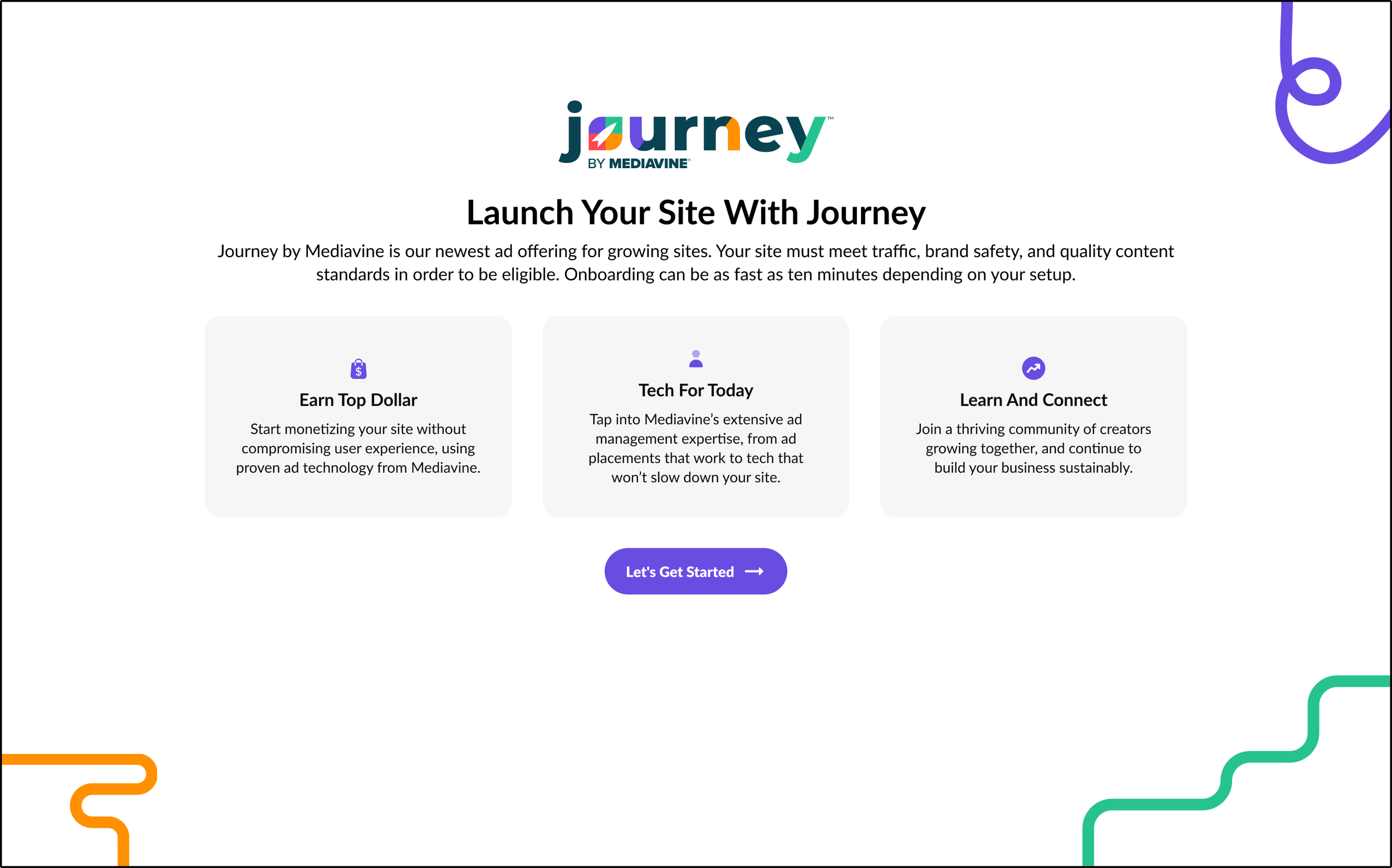 Here, I created a landing page for Journey’s onboarding process, pitching publishers on the pros of joining Journey, and an inviting CTA to get the process started. The lightweight iconography, generous whitespace, and colorful assets create an experience that is both inviting and relaxing.