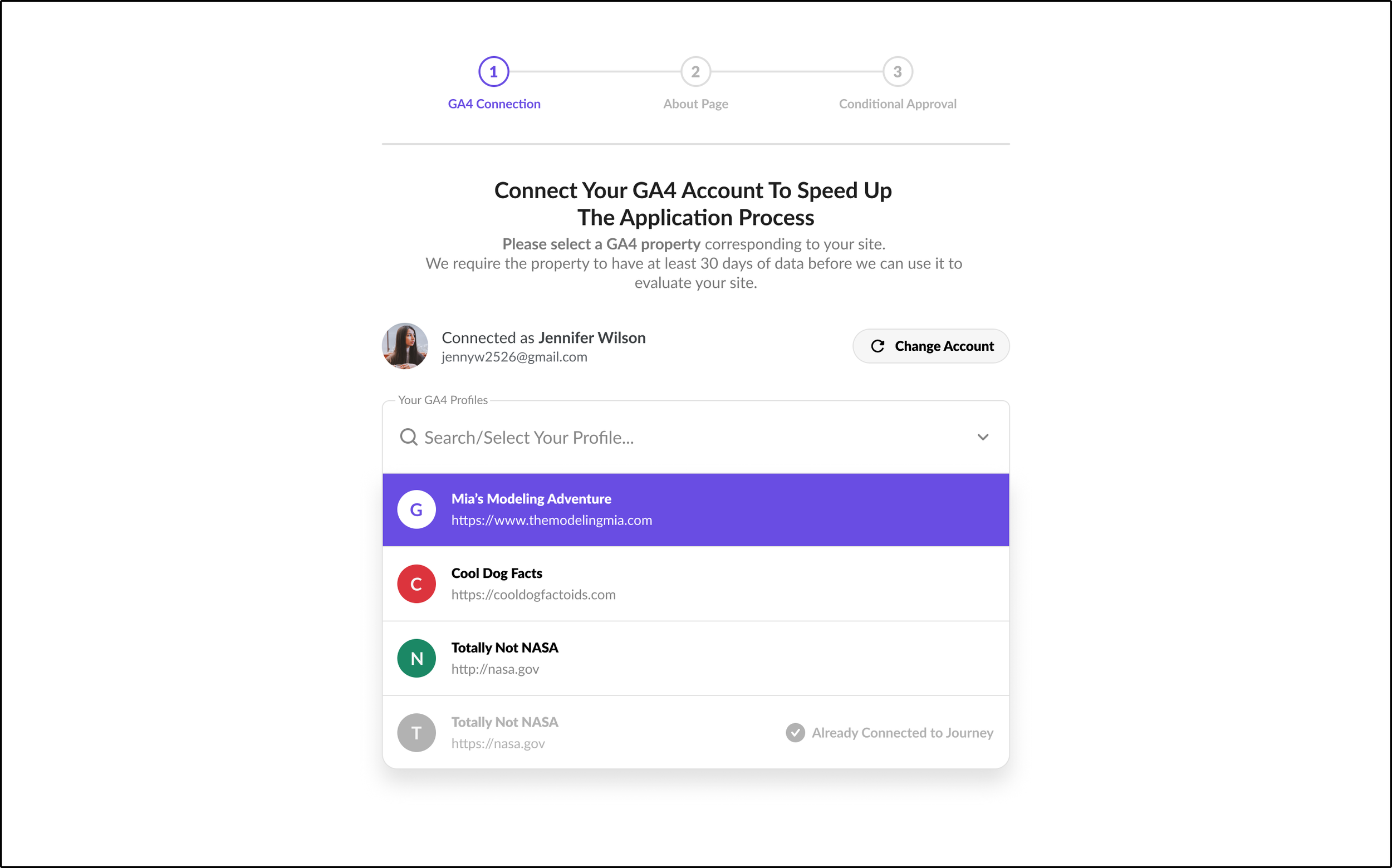 This page is our Google Analytics Profile selection page; in order to decrease user friction, we automatically pull the user’s GA4 profile and their affiliated sites if they signed up to Journey through Google.