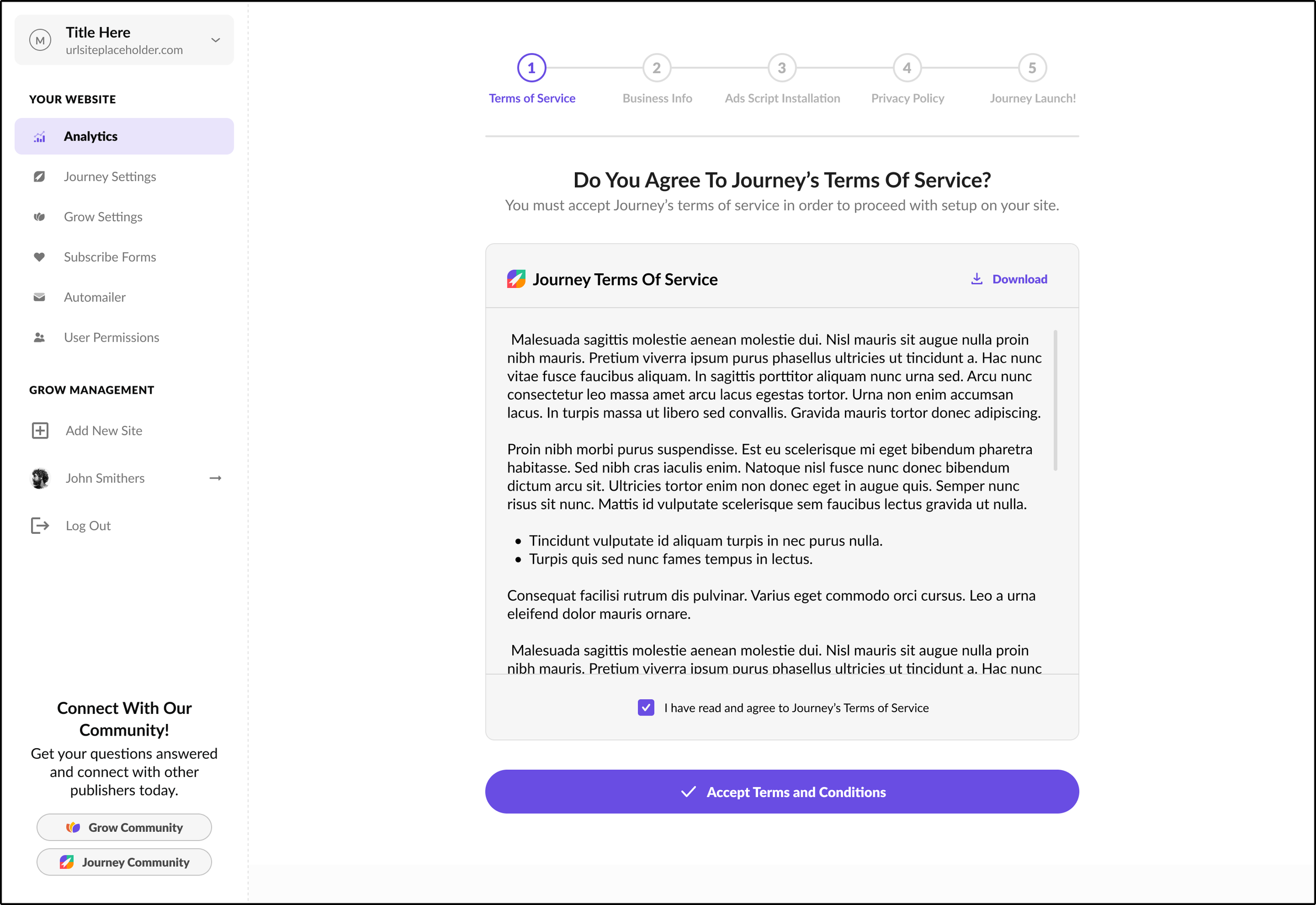Once the user has created or logged into their account, the account sidebar appears! If this is the first site the publisher is onboarding onto Journey, they have to agree to our Terms of Service. This is the screen for that.