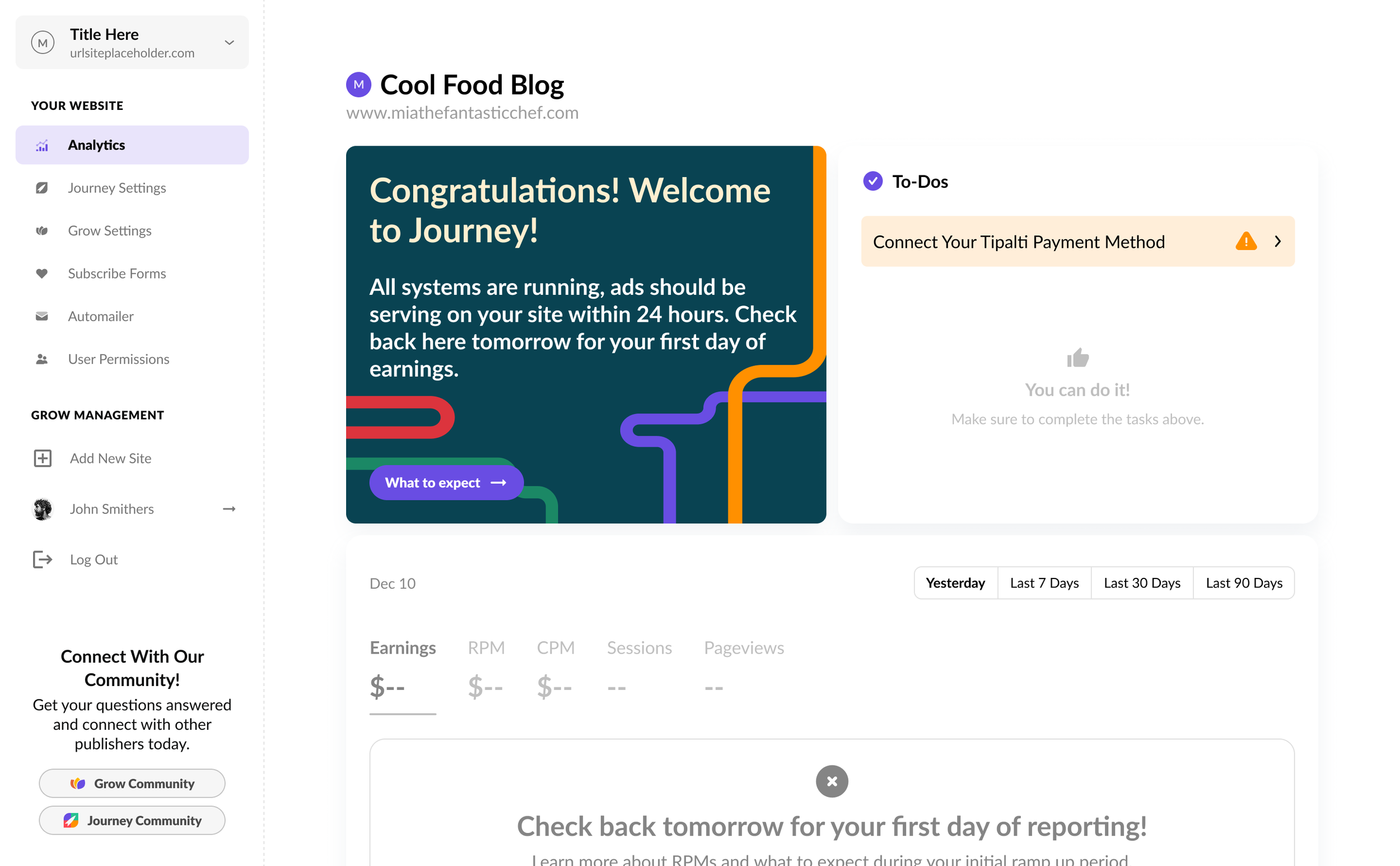 After a publisher has finished onboarding, bam! This is the quick view of their analytics page. They have a to-do list for any errors or optimizations they can complete to increase site performance, and graphs of their Earnings, RPM, CPM, Sessions, and Pageviews.